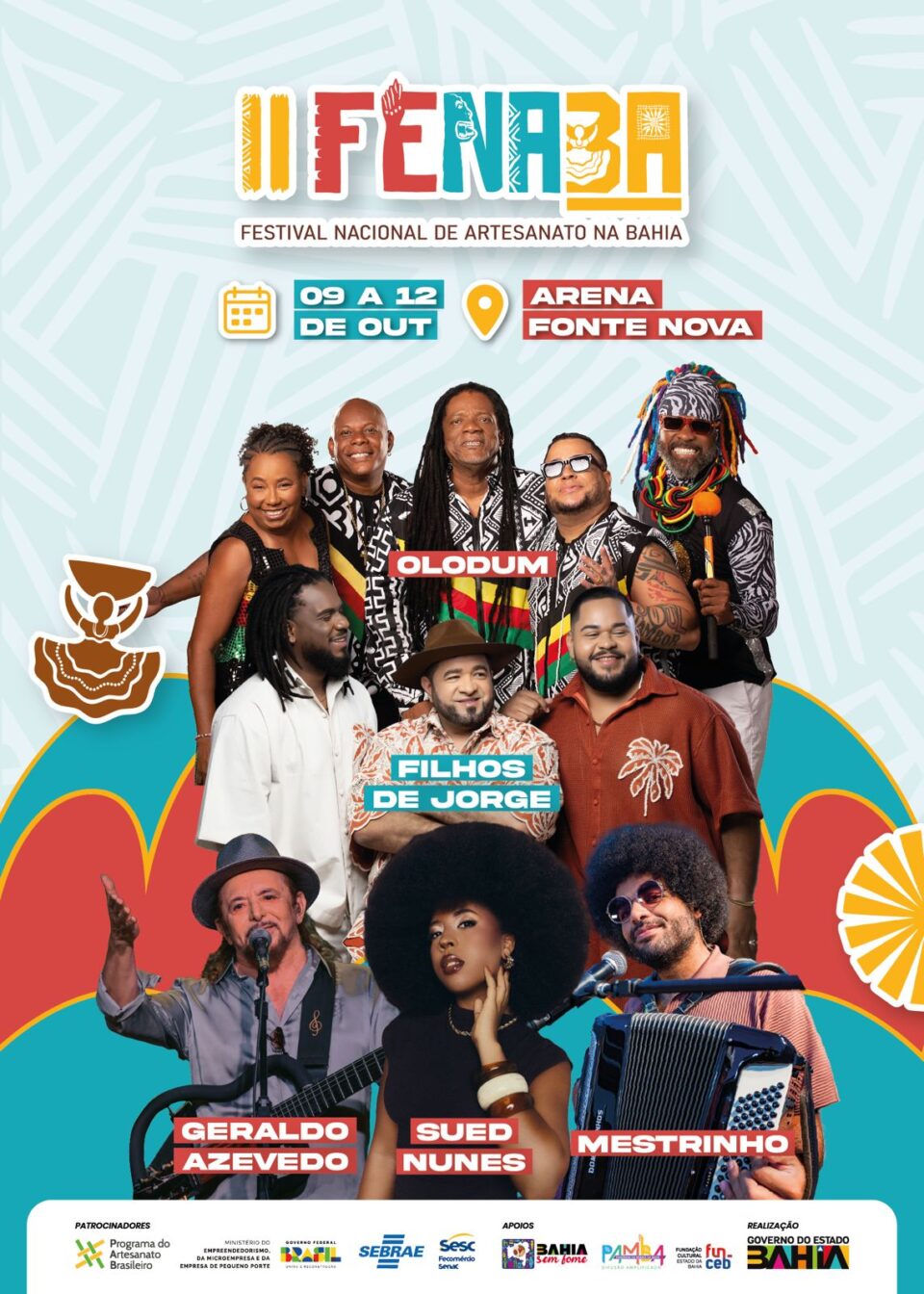 O mais elegante e charmoso encontro do artesanato brasileiro está de volta, e com o dobro do tamanho! A 2ª edição do Festival Nacional de Artesanato na Bahia – FENABA eleva o patamar cultural e anuncia uma programação grandiosa, com shows de Mestrinho, Olodum, Sued Nunes, Geraldo Azevedo e Filhos de Jorge, que fará a Arena Fonte Nova vibrar, de 9 a 12 de outubro. Sob o tema “Letras e Ritmos: A Sinfonia do Artesanato da Bahia”, o evento, que é gratuito, já está em contagem regressiva para promover uma imersão na arte e cultura nordestina para todos os visitantes. Além das atrações musicais anunciadas, o FENABA também abre espaço para o brilho dos talentos locais, com as apresentações de Graça, Capoeira em Movimento, Laiô, Sertanília, Pedro Pondé e muito mais.