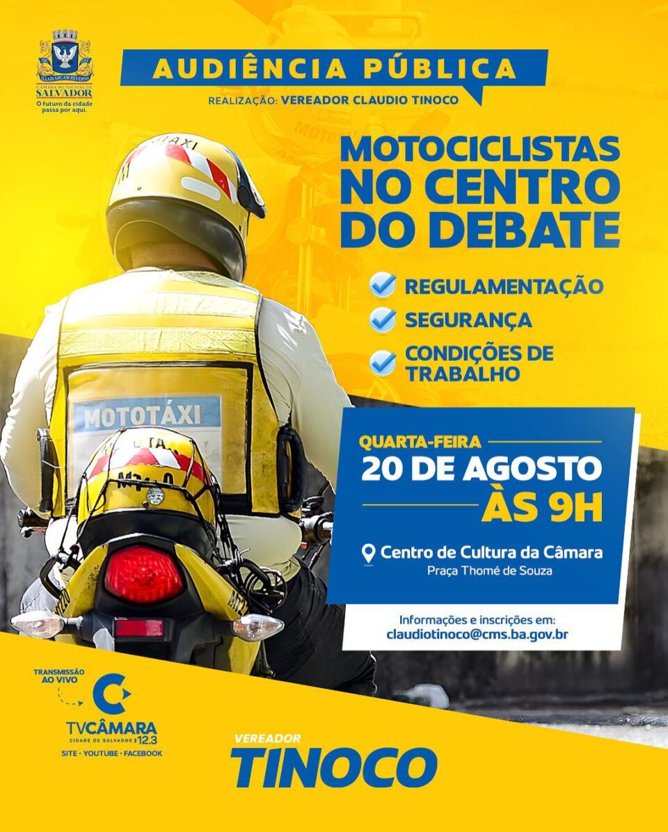 O vereador Claudio Tinoco (União Brasil) realiza, nesta quarta-feira (20), às 9h, uma audiência pública no Centro de Cultura da Câmara Municipal de Salvador para debater a situação dos motociclistas que trabalham na cidade.