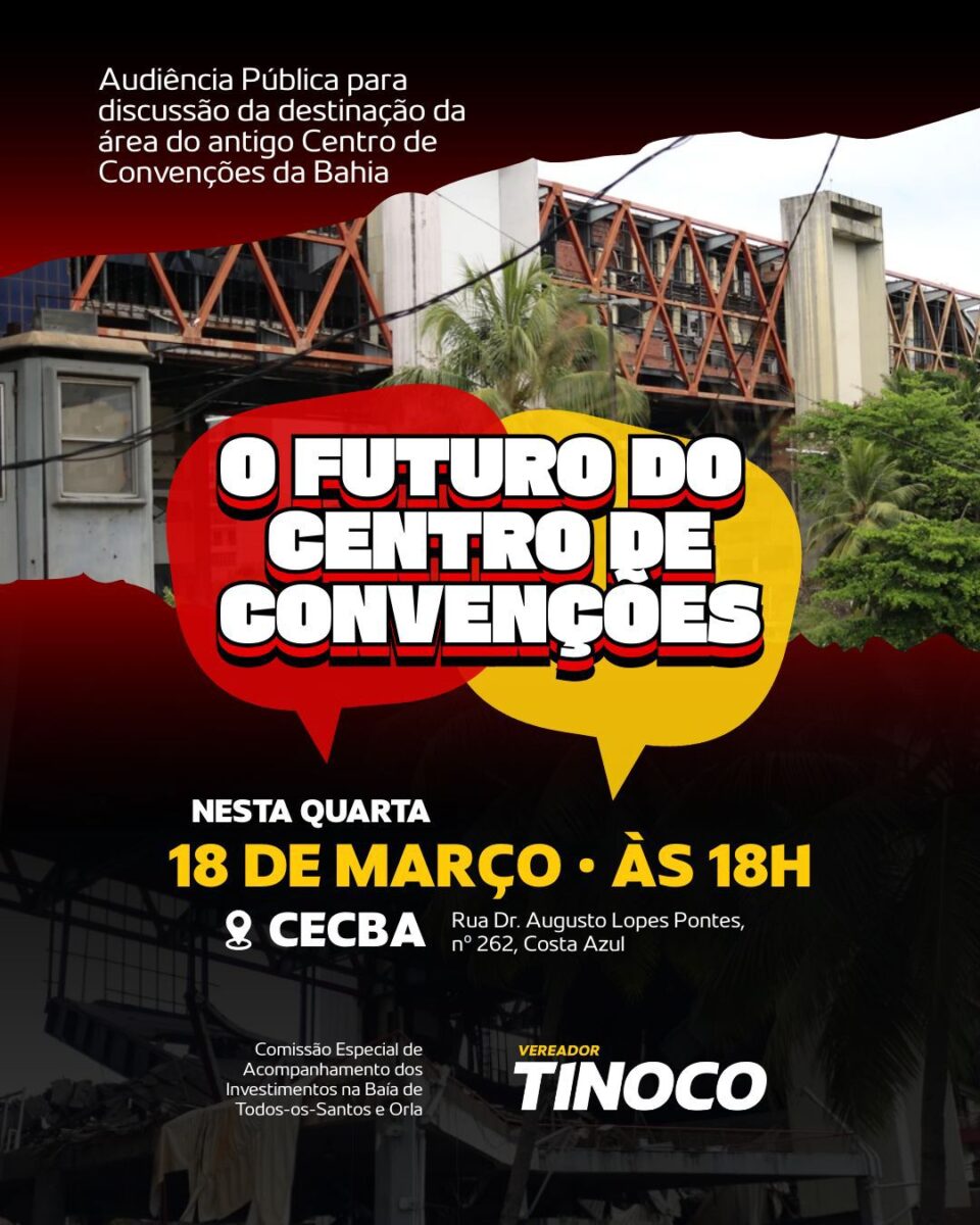 A Câmara Municipal de Salvador realizará, nesta quarta-feira (18), às 18h, uma audiência pública para discutir a destinação da área do antigo Centro de Convenções da Bahia. O encontro acontecerá no CECBA, no bairro do Costa Azul. A iniciativa é da Comissão Especial de Acompanhamento dos Investimentos na Baía de Todos-os-Santos e Orla, presidida pelo vereador Claudio Tinoco (União Brasil).