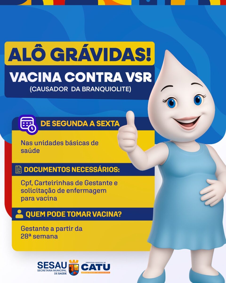 A Prefeitura Municipal de Catu, por meio da Secretaria Municipal de Saúde (SESAU), começou a ofertar a vacina contra o Vírus Sincicial Respiratório (VSR) — principal causador da bronquiolite — para gestantes do município. A iniciativa reforça o compromisso da gestão em ampliar a proteção da saúde materno-infantil, especialmente neste período do ano em que aumentam os casos de infecções respiratórias.