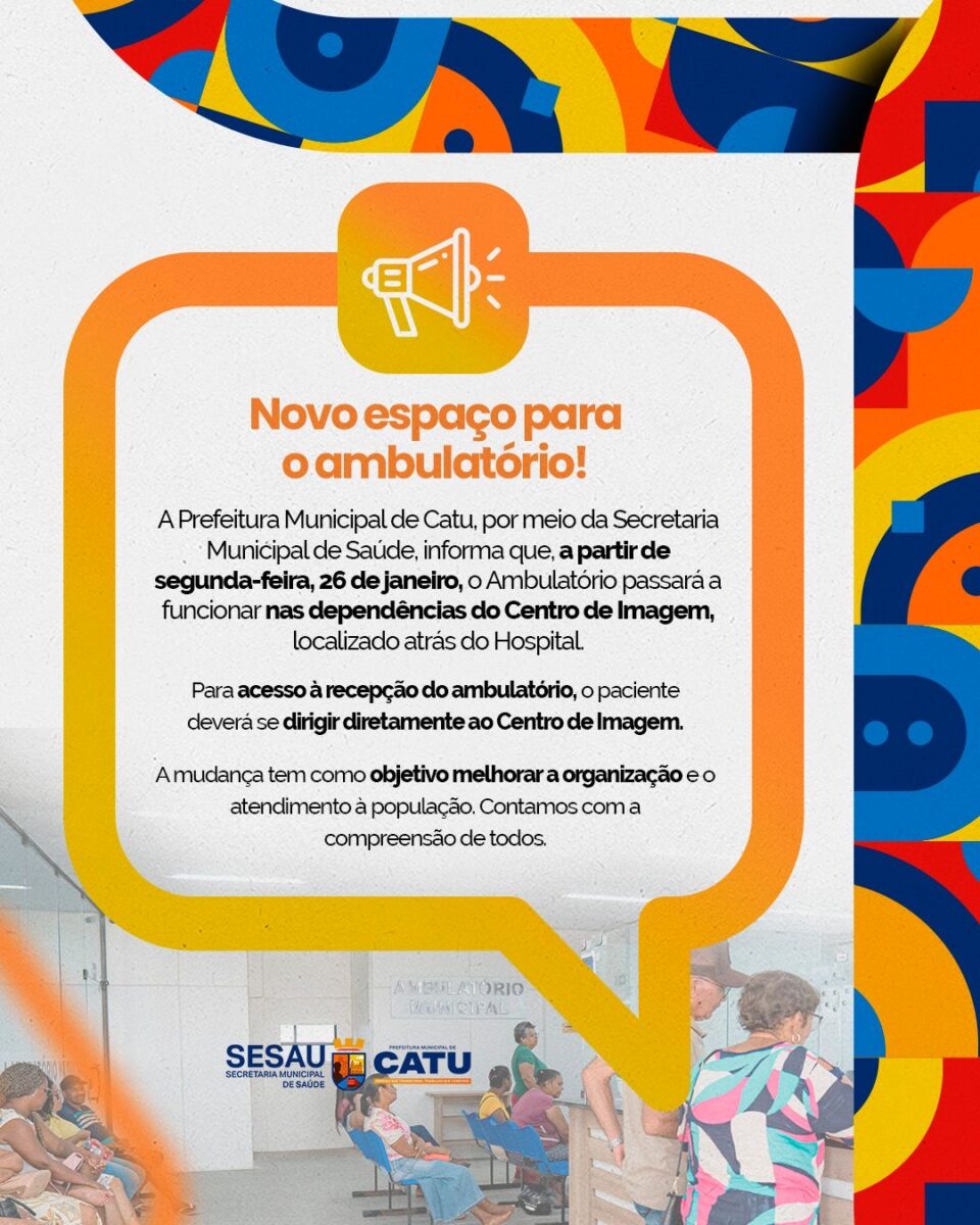 A Prefeitura Municipal de Catu, por meio da Secretaria Municipal de Saúde, comunica que, a partir de segunda-feira, 26 de janeiro, o Ambulatório Municipal passará a funcionar em novo local, nas dependências do Centro de Imagem, situado atrás do hospital.