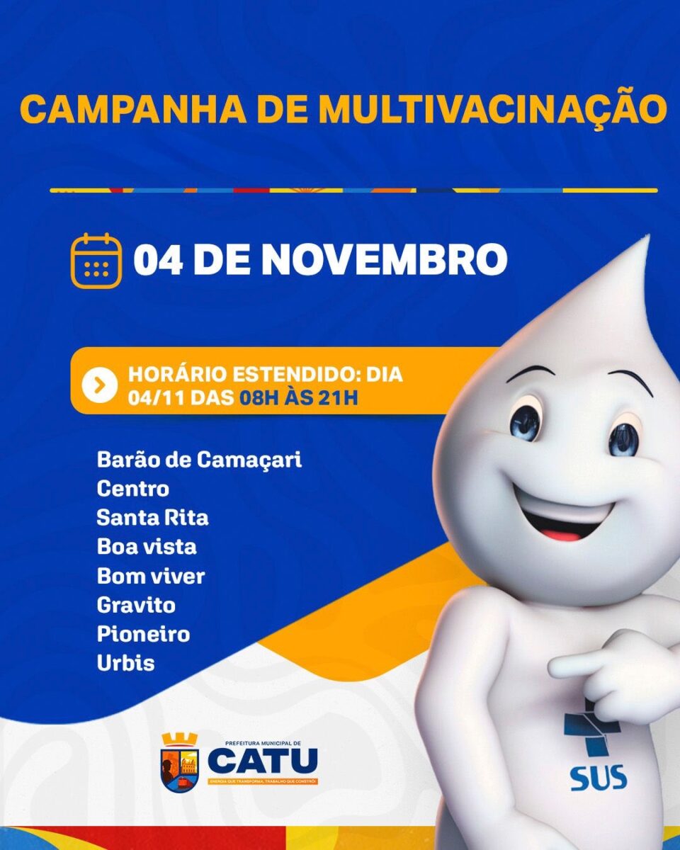 A Prefeitura de Catu, por meio da Secretaria Municipal de Saúde, realiza nesta terça-feira, 4 de novembro, a Campanha de Multivacinação, com o objetivo de atualizar a caderneta vacinal de crianças, adolescentes e adultos.
