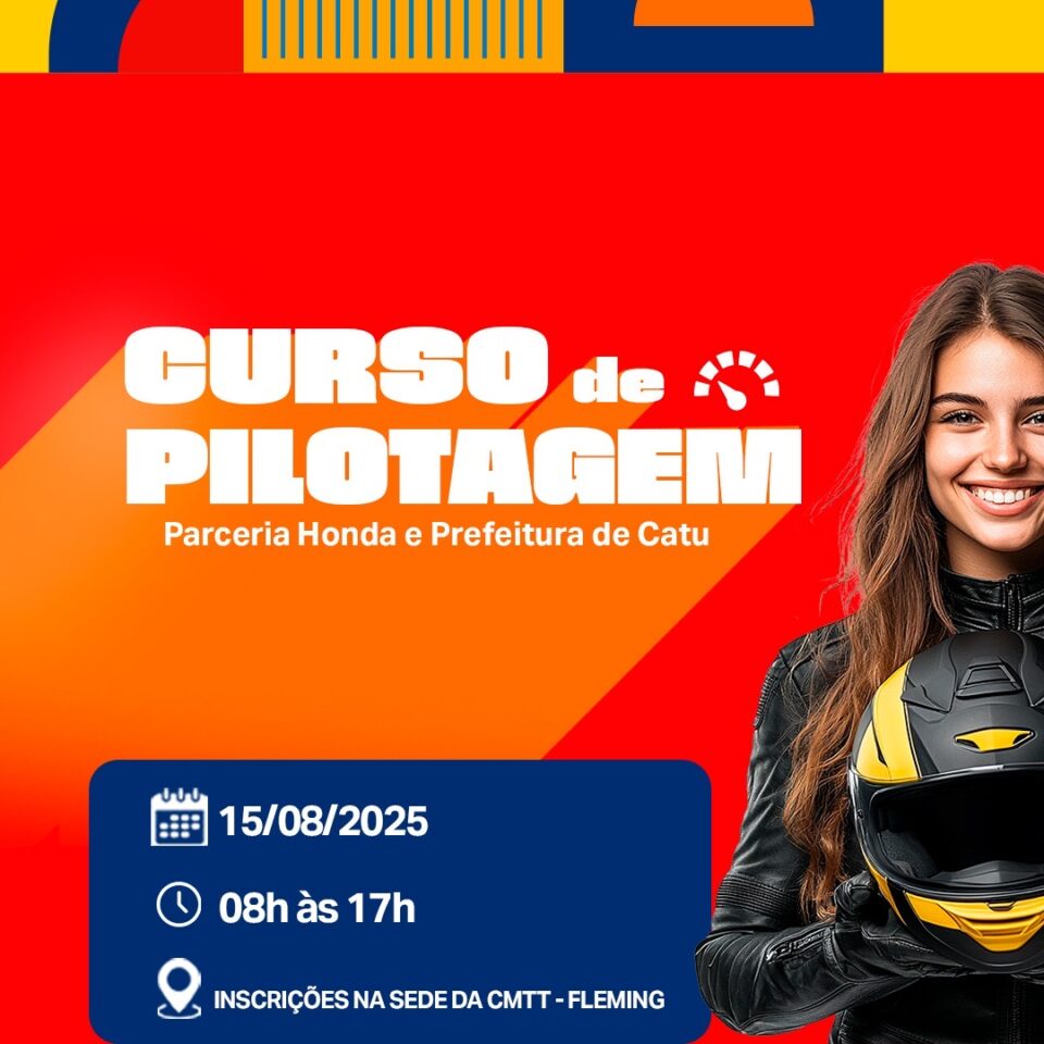 A Prefeitura Municipal de Catu, por meio da Coordenadoria Municipal de Trânsito e Transporte (CMTT), anuncia a realização de um Curso de Pilotagem em parceria com a Honda, no próximo dia 15 de agosto de 2025, das 08h às 17h.