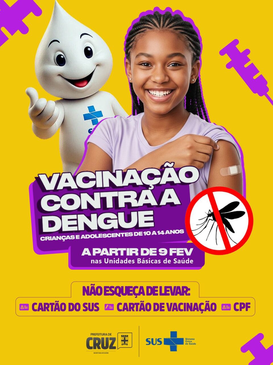 A vacina contra a dengue começará a ser aplicada nos postos de saúde de Cruz das Almas a partir desta segunda-feira (9). Inicialmente serão imunizadas crianças e adolescentes de 10 a 14 anos. Para receber a vacina, é necessário apresentar Cartão do SUS, Cartão de Vacinação e CPF.