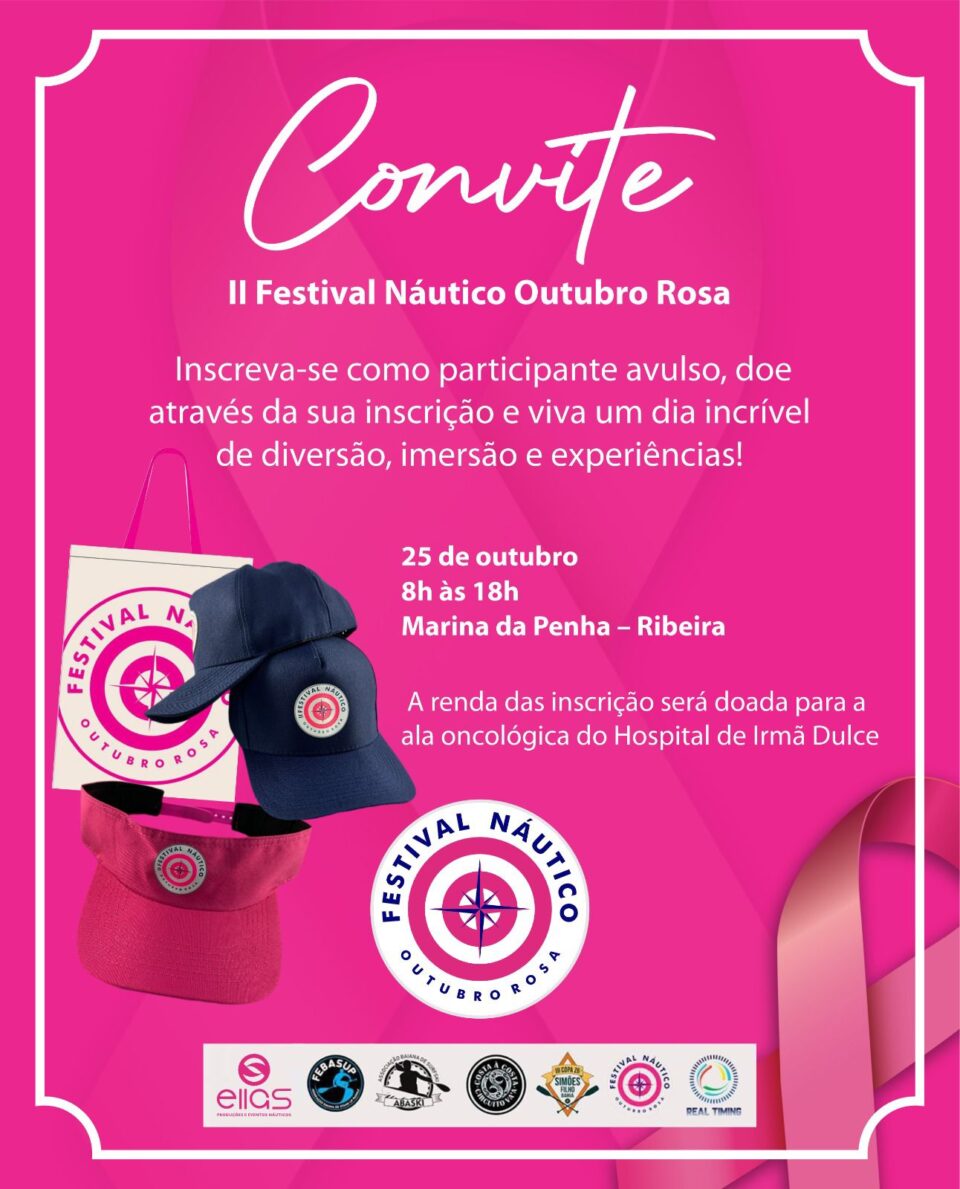 Em sua segunda edição, o Festival Náutico Outubro Rosa acontece no próximo dia 25 de outubro, das 8 às 18 horas, na Marina da Penha, na Ribeira. Durante todo o dia, a Baía de Todos-os-Santos será cenário de competições e vivências em mais de dez modalidades esportivas com a participação de atletas amadores e profissionais e pessoas interessadas em experimentar o esporte.