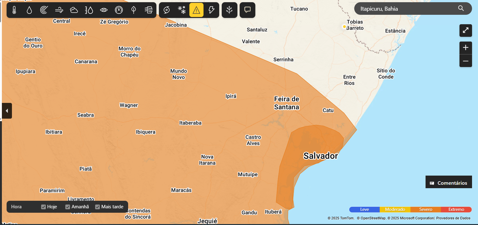 O Instituto Nacional de Meteorologia (INMET) publicou, na manhã desta segunda-feira (20), um alerta laranja de chuvas intensas para o município de Catu e região. O aviso tem início às 10h desta segunda (20/10) e segue válido até a manhã de terça-feira (21/10).
