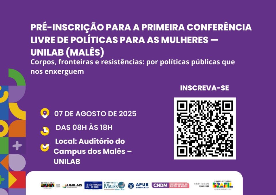 A UNILAB* – Campus dos Malês convida a toda a comunidade acadêmica, escolas do município de São Francisco do Conde & representantes da sociedade civil, do poder público & demais pessoas interessadas, para participar da 1ª Conferência Livre de Políticas para as Mulheres.