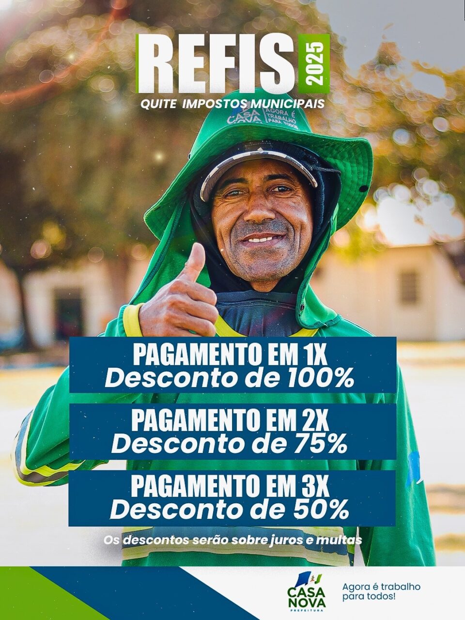 A Prefeitura de Casa Nova, por meio da Secretaria da Fazenda, lançou o Programa de Recuperação Fiscal (Refis) 2025, que oferece descontos de até 100% em juros e multas para contribuintes com dívidas junto ao município. Poderão ser renegociadas e quitadas dívidas referentes ao Imposto sobre a Propriedade Predial e Territorial Urbana (IPTU) e a Alvarás dos últimos cinco anos.