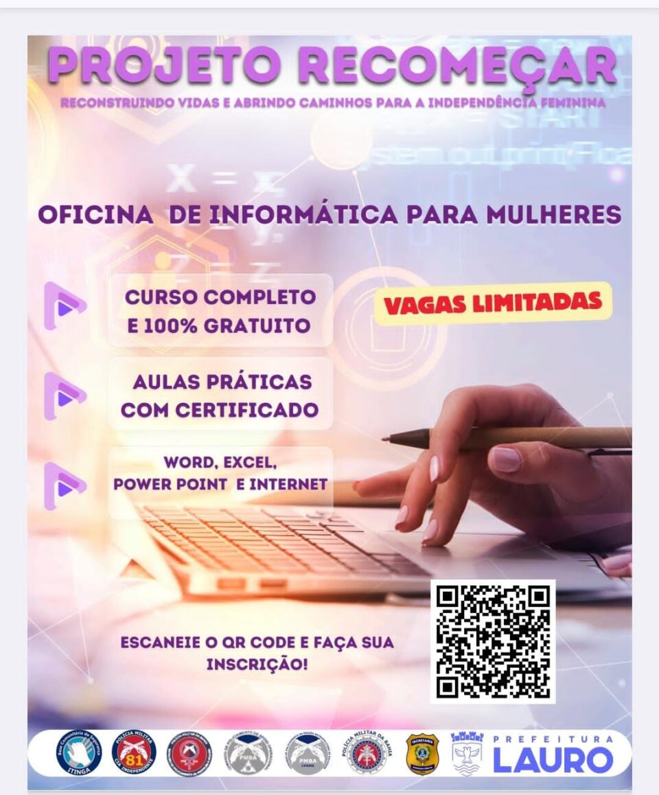 O Projeto Recomeçar é uma ação voltada à profissionalização de mulheres assistidas pelo Batalhão de Policiamento de Proteção à Mulher (BPPM), por meio da oferta de curso de Informática Básica, promovido em parceria com a Base Comunitária de Segurança (BCS) da 81ª CIPM e a Secretaria de Segurança Pública do Município de Lauro de Freitas.
