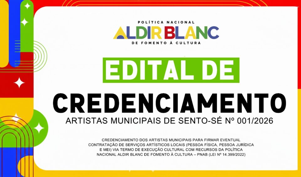 A Prefeitura de Sento-Sé, por meio da Gerência Municipal de Cultura, publicou o Edital nº 001/2026 para credenciamento de artistas locais que desejam participar dos eventos oficiais do município. As inscrições iniciaram nesta segunda-feira (13), e seguem até o dia 1º de dezembro de 2026, sempre das 8h às 13h, na sede da Gerência de Cultura.
